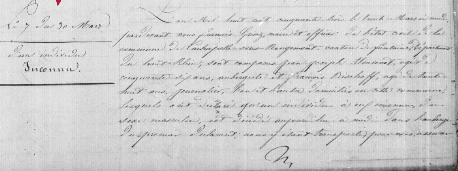 « L'an mil huit cent cinquante trois le trente mars à midi par devant nous François Grisez, maire et officier de l'état civil de la commune de Lachapelle-sous-Rougemont, canton de Fontaine, département du Haut-Rhin, sont comparus Jean Joseph Thouvenot, âgé de cinquante-six ans, aubergiste et François Bischoff, âgé de trente-huit ans, journalier, l'un et l'autre domiciliés en cette commune, lesquels ont déclaré ... »