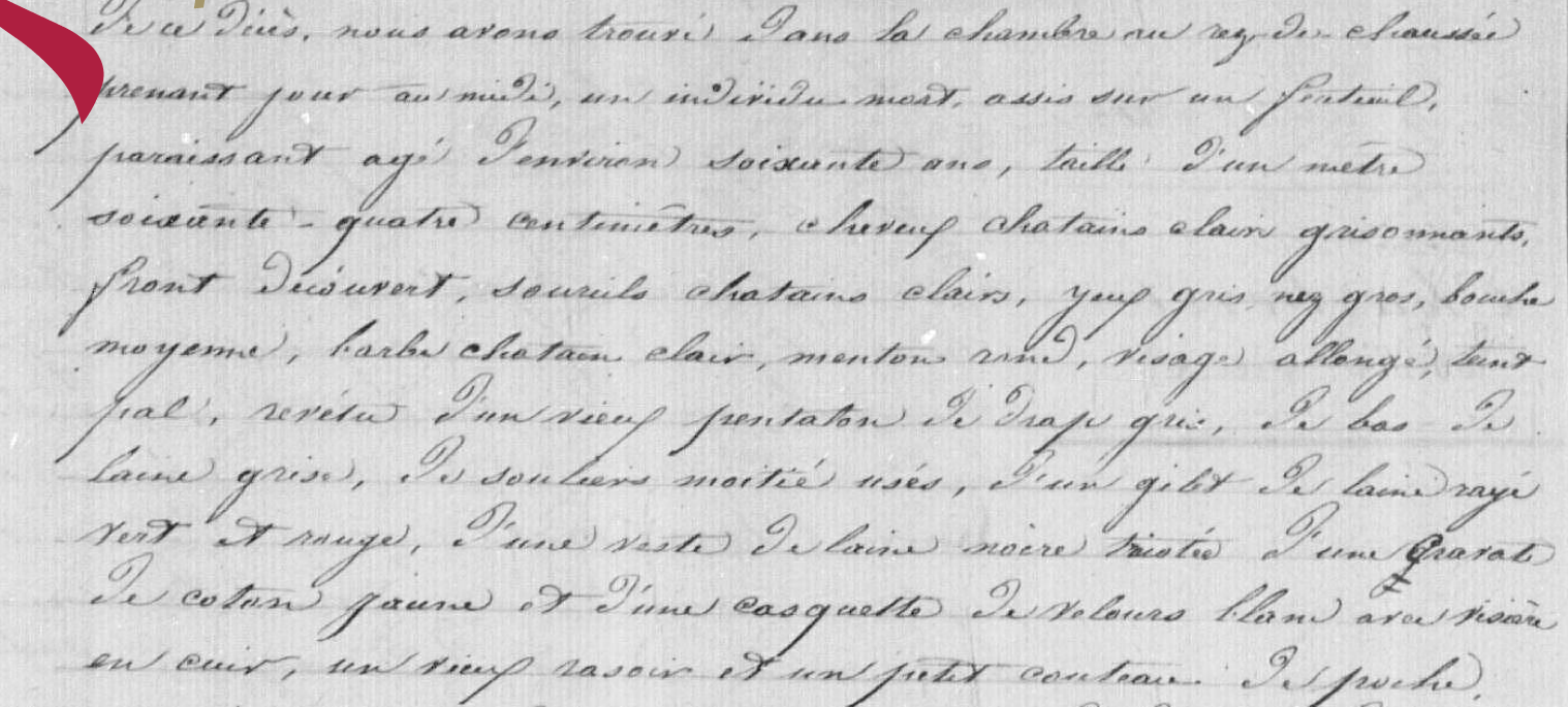 «… paraissant âgé d'environ soixante ans, taille d'un mètre soixante-quatre centimètres, cheveux chatains clair grisonnants, front découvert, sourcils chatains clairs, yeux gris, nez gros, bouche moyenne, barbe chatain clair, menton rond, visage allongé, teint pal, revétu d'un vieux pantalon de drap gris, de bas de laine grise, de souliers moitié usés, d'un gilet de laine rayé vert et rouge, d'une veste de laine noire tricotée, d'une cravate de coton jaune et d'une casquette de velours blanc avec visière en cuir, un vieux rasoir et un petit couteau de poche, un vieux porte feuille... »