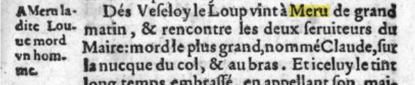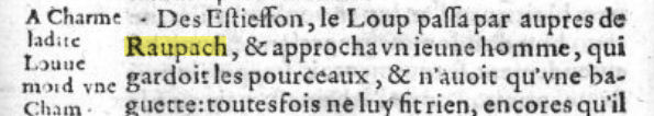 Voici des extraits de l'histoire de ce loup, dépeinte en 1591 par Jean Bauhin (originaire de Bâle) "Histoire notable de la rage des loups, avenue en 1590, avec les remèdes contre la rage causée par la morsure des bêtes enragées".Nous nous limitons au (funeste) périple de l'animal. Le lecteur intéressé pourra trouver intégralité du texte (avec les descriptions des blessures infligées et des soins dispensés, qui constituent la finalité de l'ouvrage) ici.