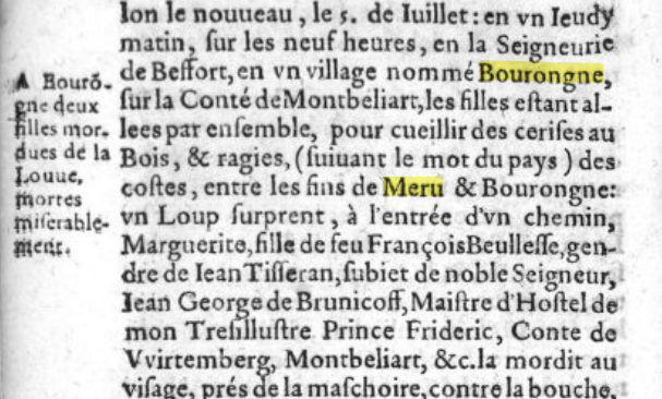 En 1590, dans le comté de Montbéliard à Bourogne un loup enragé attaque deux petites filles en train de cueillir des cerises. Tout le comté subit la crainte et l’angoisse face à ces attaques combinées de plusieurs loups selon le médecin Jean Bauhin (une louve en la seigneurie de Belfort et deux loups dans le comté de Montbéliard).