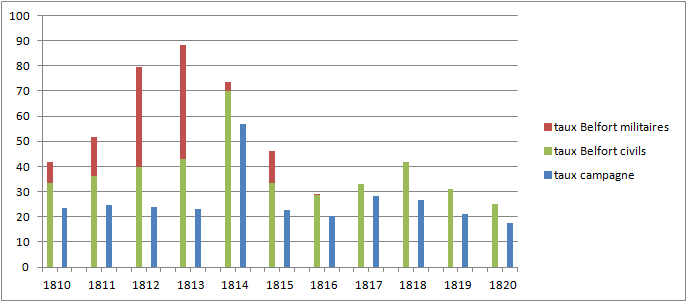 On observe ainsi une corrélation des taux belfortains (maximum en 1813-1814, maximum secondaire en 1817-1818) avec ces valeurs au plan national. Avec des valeurs considérablement plus élevées pour les premiers.