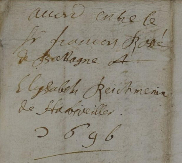 Elizabeth REICHMENin, assistée de Jean MAIRE (le parrain de l'enfant), accepte d'abandonner l'accusation de paternité qu'elle a faite à François ROSSÉ, et toutes actions ultérieures contre celui-ci, en échange de la somme de 60 livres, que celui accepte de verser pour éviter un procès devant l'officialité d'Alsace.