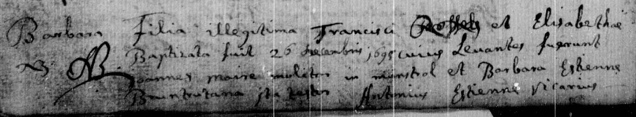 Le 25 décembre 1695 est baptisée à Montreux-Château une enfant de sexe féminin, prénommée Barbe, dont il est bien difficile de déterminer quel patronyme a pu lui être attribué ultérieurement (si elle a survécu) :