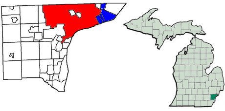 Le comté de Wayne dans le Michigan ; en rouge la communauté de Detroit ;