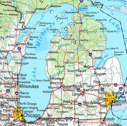 Le Michigan, bordé par les lacs Huron et Michigan, avec au sud la