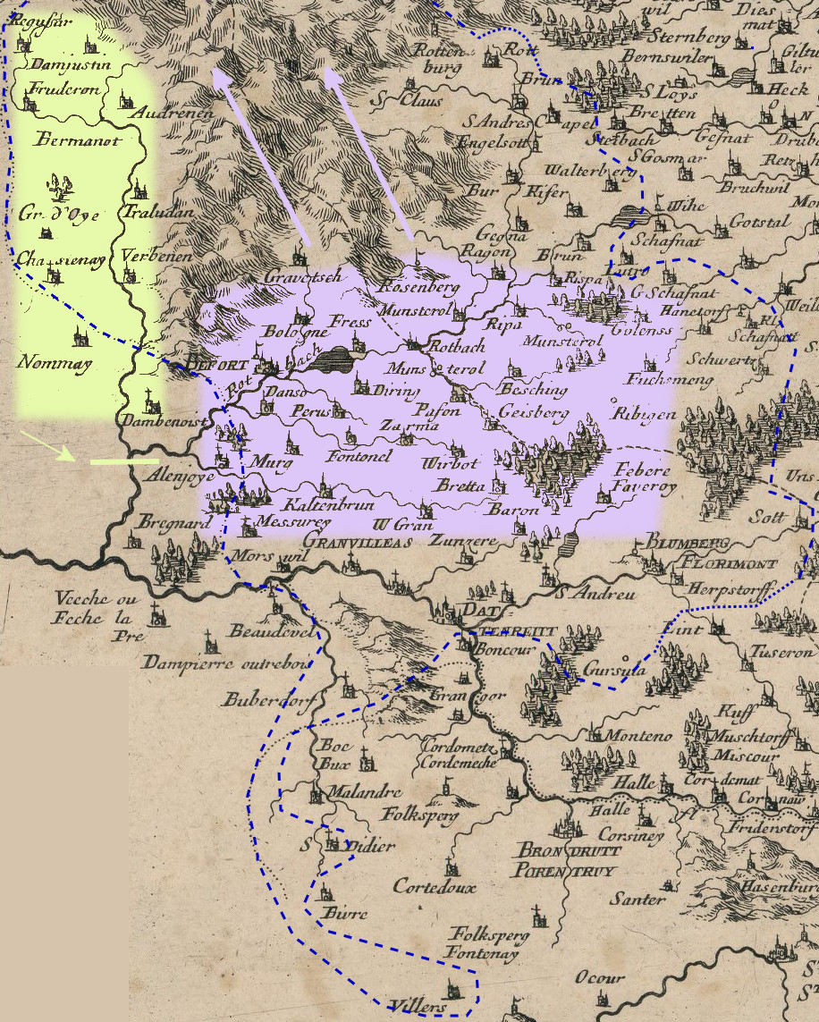 Sur la carte de droite, nous avons encerclé dans le trait pointillé bleu les villages situés actuellement dans le département du Territoire-de-Belfort