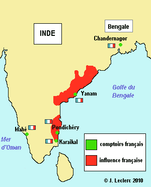 Au début du 17e siècle, les anglais et les hollandais avaient fondé des compagnies commerciales installées dans certains ports indiens afin d'ouvrir des liaisons commerciales avec l'Asie. Sous l'impulsion de Richelieu et plus tard, de Colbert, la France crée en 1662 la Compagnie Française des Indes Orientales et établit au cours du 18e siècle des comptoirs dans plusieurs villes de ce sous-continent. Les cours de géographie de l'école primaire ont laissé quelques souvenirs de leurs noms aux plus anciens d'entre nous : Chandernagor, Yanaon, Karikal, Mahé et Pondichéry. Le rôle de ces comptoirs était initialement purement commercial. Cependant, ils vont très rapidement devenir des enjeux politiques à travers la démarche d'élargissement menée par Dupleix pour contrecarrer les velléités colonisatrices des anglais dans ce secteur.