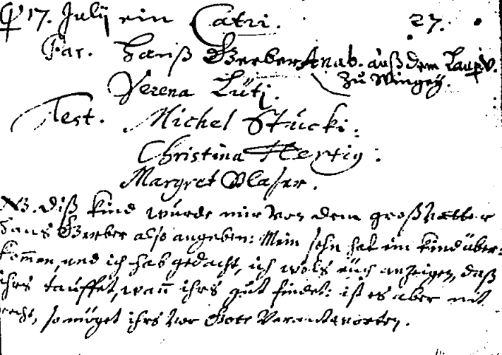 (Hans Gerber anabaptiste des chaumes de Wingey) NB : Cet enfant m'a été ainsi présenté par le grand-père Hans Gerber : "Mon fils m'a remis un enfant, et j'ai pensé vous le montrer pour que vous le baptisiez, si bon vous semble ; mais si ce n'est pas le cas, vous devrez en répondre devant Dieu."