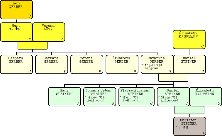 B 1726 Hans Gerber ; 1734 id. ; 1739 id. || B 1740 (18 ans) Catherine Gerber, fille de Hans et veuve de Daniel Steiner et leurs fils Hans et Daniel Steiner || B 1758 (9 ans) Hans Steiner || B 1779 (18 ans) Hans Steiner et son fils Daniel Steiner
