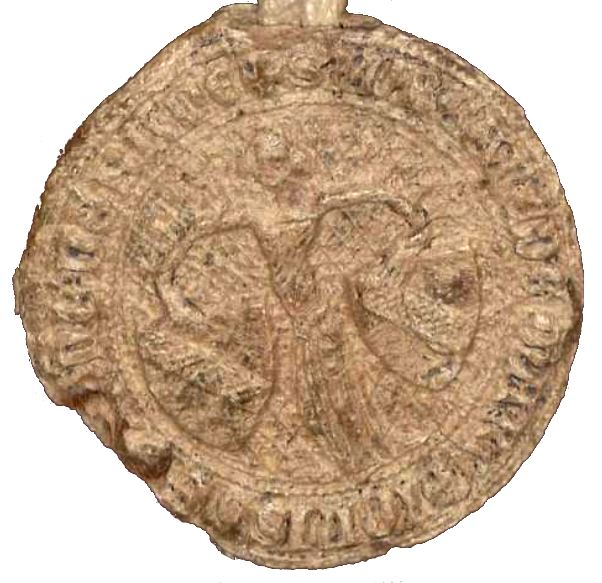 Et moi Theobald de Underswilre, prêtre du diocèse de Bâle, notaire public juré par autorité Impériale, puisque j'ai personnellement assisté à tous les actes ci-dessus sans exception au moment où ils se passaient, comme il est rapporté ci-avant, les an, jour et mois que dessus, indiction XV, en la sixième année du Pontificat de notre Très Saint Père dans le Christ, notre vénéré ClémentClément VI, pape par la providence de Dieu, au lieu ci-dessus désigné peu avant les vêpres, en présence de discrètes personnes messires Jean, dit Hannower, maréchal de madame la susdite duchesse, Pierre dit Schaller, de Bâle, Henmann de Roppe, chevaliers, et de messire Hugues de Ronenach, chanoine, prêtre de l'église de Belfort, témoins appelés et convoqués aux susdits actes, et puisque, avec les susdits témoins, j'ai vu et entendu faire absolument tous les actes ci-dessus, j'ai écrit de ma propre main le présent document, sur la demande et la réquisition instante des deux sœurs susnommées, je l'ai rédigé pour lui donner cette forme officielle, et je l'ai signé de mon seing habituel, sur leur demande.Les quatre sceaux pendants (il en manque probablement un à gauche) sont malheureusement peu identifiables sur l'image en ligne, hormis le dernier (ci-dessous à gauche) qui est le sceau de la comtesse Jeanne de Montbéliard :