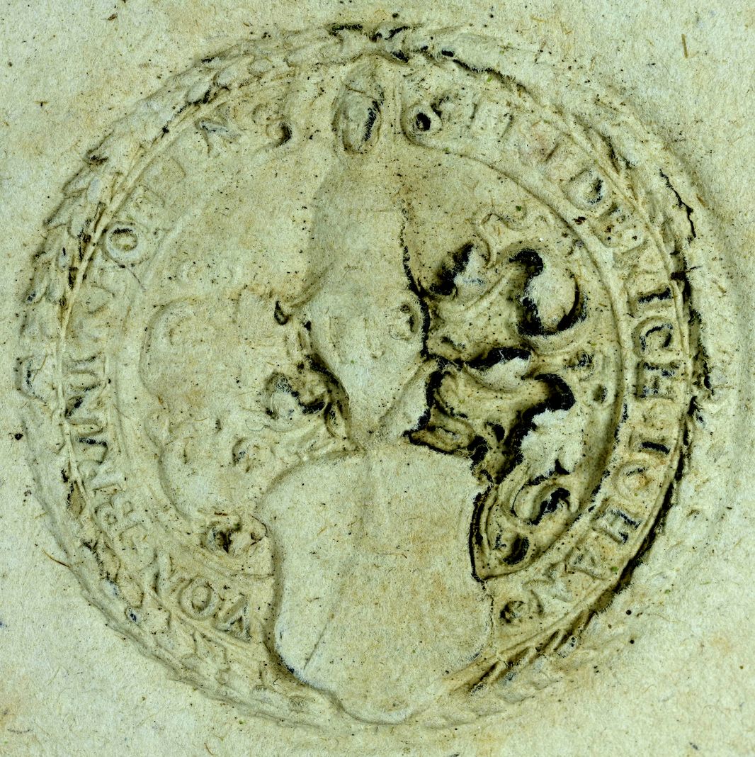 Le blason de la famille n'occupe qu'une petite partie du sceau, au centre en bas ; il est surmonté d'un heaume et des lambrequins en forme de volutes marquant la noblesse ; le cimier est peu visible.