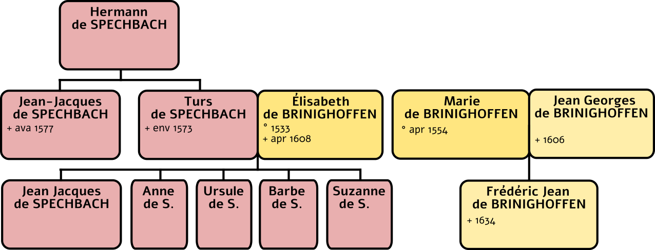- Le même Jean-Georges de Brinighoffen n'étant pas un descendant du fondateur de la Maison Brinighoffen de Bourogne, il nous est paru judicieux de le marquer, ainsi que son fils, d'une couleur différente des membres agnatiques de cette Maison. Au même titre finalement que les seigneurs Spechbach de Bourogne.