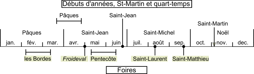 Le tableau ci-dessous donne un aperçu du rythme annuel des événements "civils" constitués par ces foires et les découpages officiels de l'année :