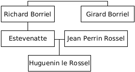 Huguenin le Rossel fils d'Estevenatte fille de Richard Boriel fonde un anniversaire (acte inachevé) ; l'acte précédent est en effet l'anniversaire dudit Richard et de Girard Boriel son frère, fondé par ladite Estevenate, femme de Jean Perrin Rossel (nom difficile à déchiffrer) le Crevoisier. Huguenin le Rossel est ainsi en réalité fils de Jean Perrin Rossel, mais l'acte ne mentionne que sa filiation maternelle... Sa filiation paternelle apparaît dans un compte communal de 1487.