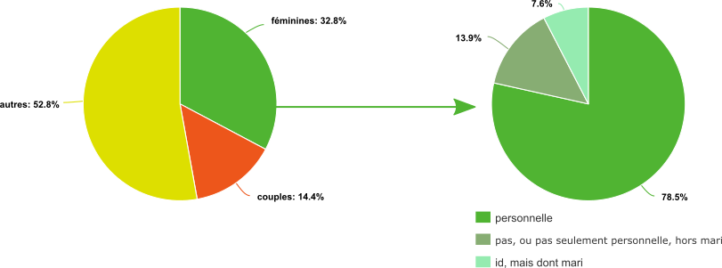 À droite, on constate que les femmes fondent principalement des anniversaires pour elles-même, mais aussi pour un parent ou des groupes familiaux (un ou deux parents, enfants, frères ou sœurs). Il leur arrive même de fonder un anniversaire pour leur conjoint. Les biens qu'elles engagent ne sont jamais désignés comme des biens communs du couple, on peut donc les voir comme des biens propres.