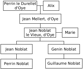 - l'individu "central" de cet acte, Jean Noblat, est fréquemment cité dans le 1g26-1 ; il est presque toujours lié au précédent, Mellert d'Oye (11), son père ; on admet (avec De Villèle) qu'il s'identifie à "Jean Noblat le Vieux, d'Oye", auquel sont rattachés 2 fils, Jean, et Genin ; il a vécu autour de 1450 ; décédé avant 1478 ; Marie, son épouse (plus précisément, épouse de Jean Noblat le Vieux) n'est pas nécessairement la mère de ses fils.