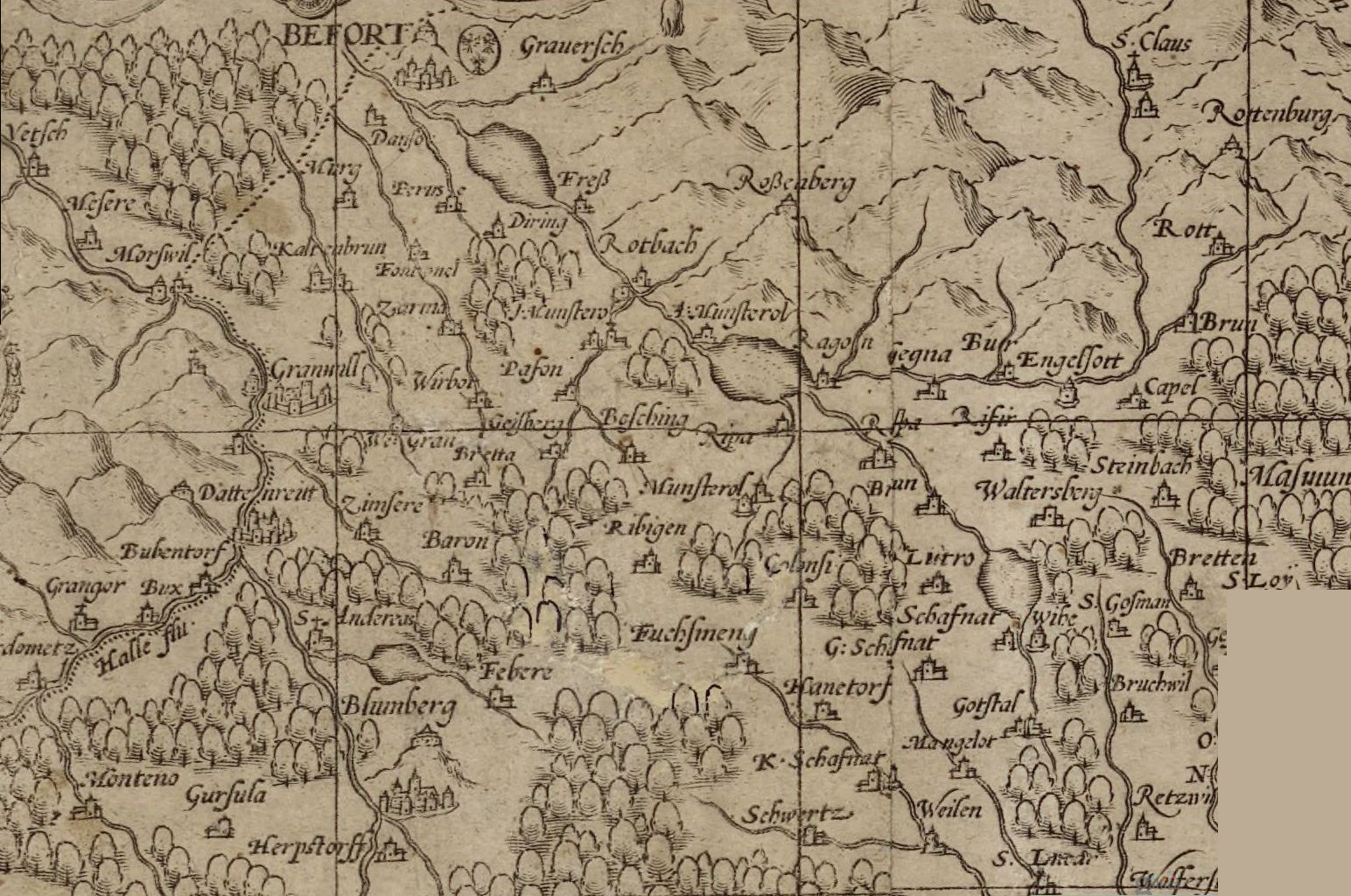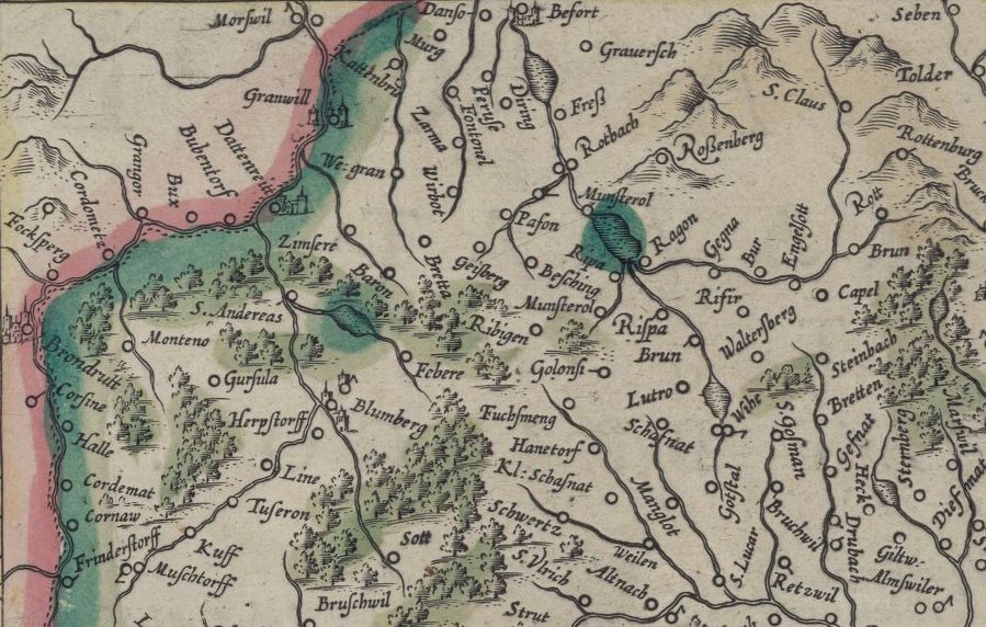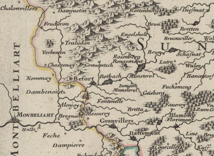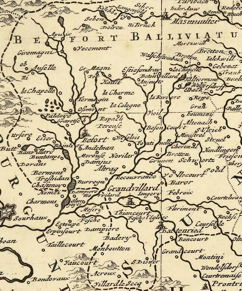Pourtant, Sebastian Münster, géographe allemand (1488-1552), quand il dessine l'Alsace, néglige systématiquement l'essentiel de la région de Belfort, mentionnant tout au plus Delle, Florimont, et parfois, comme ci-dessous, Grandvillars :