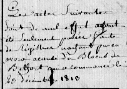 Complément : Cette situation trouve une illustration dans une note en marge des registres d'état-civil de Chèvremont en 1813 :