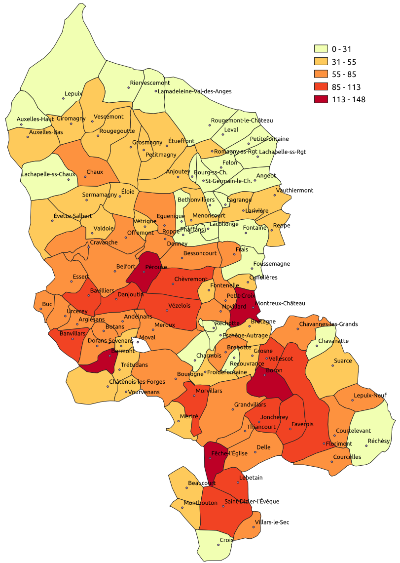 - une extension aux campagnes avoisinantes du phénomène belfortain ; mais ceci n'explique guère que des villages plus éloignés (Montreux-Château, avec prolongement dans le Haut-Rhin voisin ; et tout le sud du département) soient si fortement touchés,