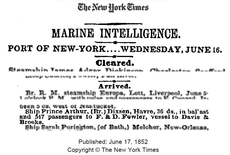 la traversée suivante, en août 1852 : |