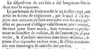 Le parlement de Paris rendit le 29 Juillet 1595, un arrêt en forme de rêglement, par lequel il fut enjoint aux notaires de faire entendre aux femmes qu’elles ne peuvent s’obliger valablement pour autrui, sur-tout pour leurs maris, sans renoncer expressément au bénéfice du velleïen, & de l’autentique si quoe mulier, & d’en faire mention dans leurs minutes, à peine d'en répondre en leur nom, & d'être condamnés aux dommages & intérêts des parties."