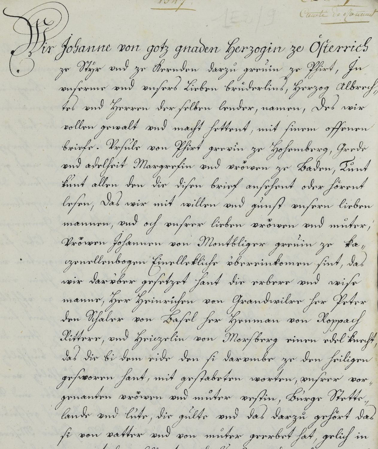 Wir Johanne von Gotz gnaden Herzogin ze Osterrich,ze Styr, und ze Kernden, darzu Grevin ze Phirt, in