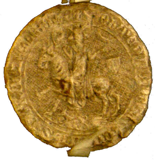 Et moi Theobald de Underswilre, prêtre du diocèse de Bâle, notaire public juré par autorité Impériale, puisque j'ai personnellement assisté à tous les actes ci-dessus sans exception au moment où ils se passaient, comme il est rapporté ci-avant, les an, jour et mois que dessus, indiction XV, en la sixième année du Pontificat de notre Très Saint Père dans le Christ, notre vénéré ClémentClément VI, pape par la providence de Dieu, au lieu ci-dessus désigné peu avant les vêpres, en présence de discrètes personnes messires Jean, dit Hannower, maréchal de madame la susdite duchesse, Pierre dit Schaller, de Bâle, Henmann de Roppe, chevaliers, et de messire Hugues de Ronenach, chanoine, prêtre de l'église de Belfort, témoins appelés et convoqués aux susdits actes, et puisque, avec les susdits témoins, j'ai vu et entendu faire absolument tous les actes ci-dessus, j'ai écrit de ma propre main le présent document, sur la demande et la réquisition instante des deux sœurs susnommées, je l'ai rédigé pour lui donner cette forme officielle, et je l'ai signé de mon seing habituel, sur leur demande.Les quatre sceaux pendants (il en manque probablement un à gauche) sont malheureusement peu identifiables sur l'image en ligne, hormis le dernier (ci-dessous à gauche) qui est le sceau de la comtesse Jeanne de Montbéliard :