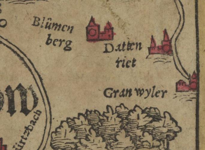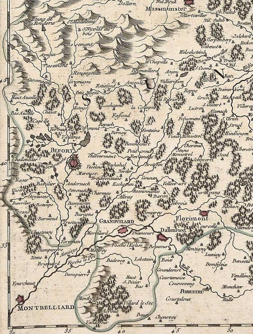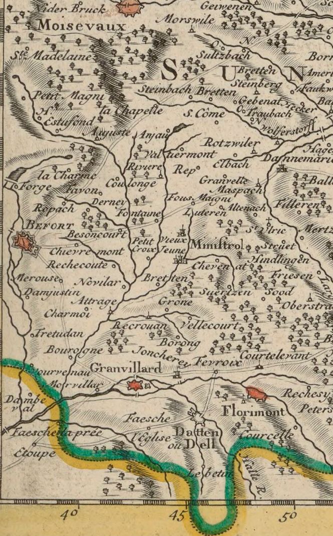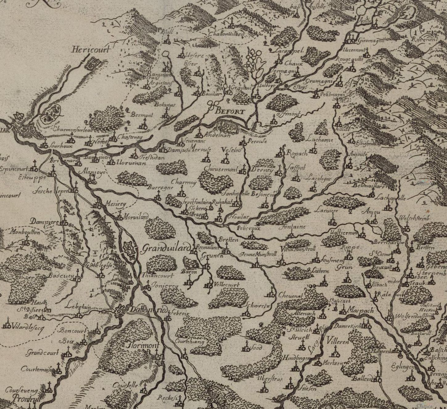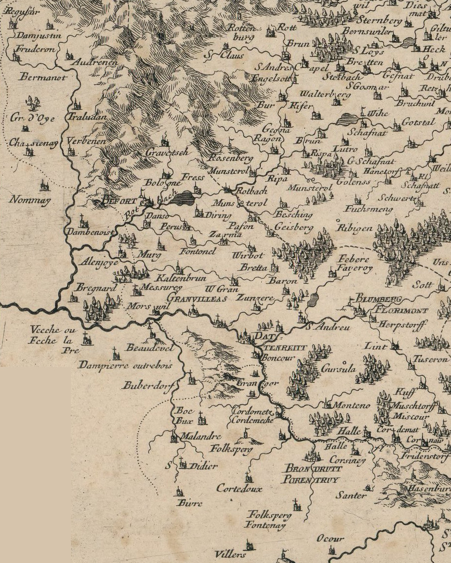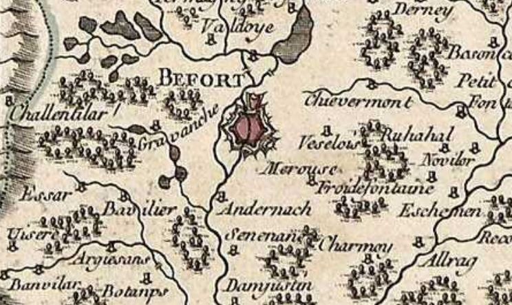 Pourtant, Sebastian Münster, géographe allemand (1488-1552), quand il dessine l'Alsace, néglige systématiquement l'essentiel de la région de Belfort, mentionnant tout au plus Delle, Florimont, et parfois, comme ci-dessous, Grandvillars :
