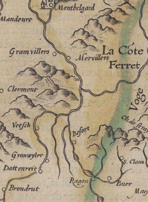 Dans la même collection, et la même année, on trouve également cette carte intitulée Burgundia Comitatus (comté de Bourgogne = Franche Comté). Elle est orientée (grossièrement) Ouest-Est, et fait apparaître notre secteur (ne pas tenir compte des "frontières" tracées à posteriori en couleur) en bas à droite :On reconnaît un peu l'hydrographie de la 1ère carte, autour de Belfort. Mais l'exactitude n'est visiblement pas une obsession pour l'atelier Mercator, car, au delà des déformations, la localité de Grandvillars est figurée 2 fois, à 4 lieues (environ 15 km) de distance (Gramvillers et Granwyler) !