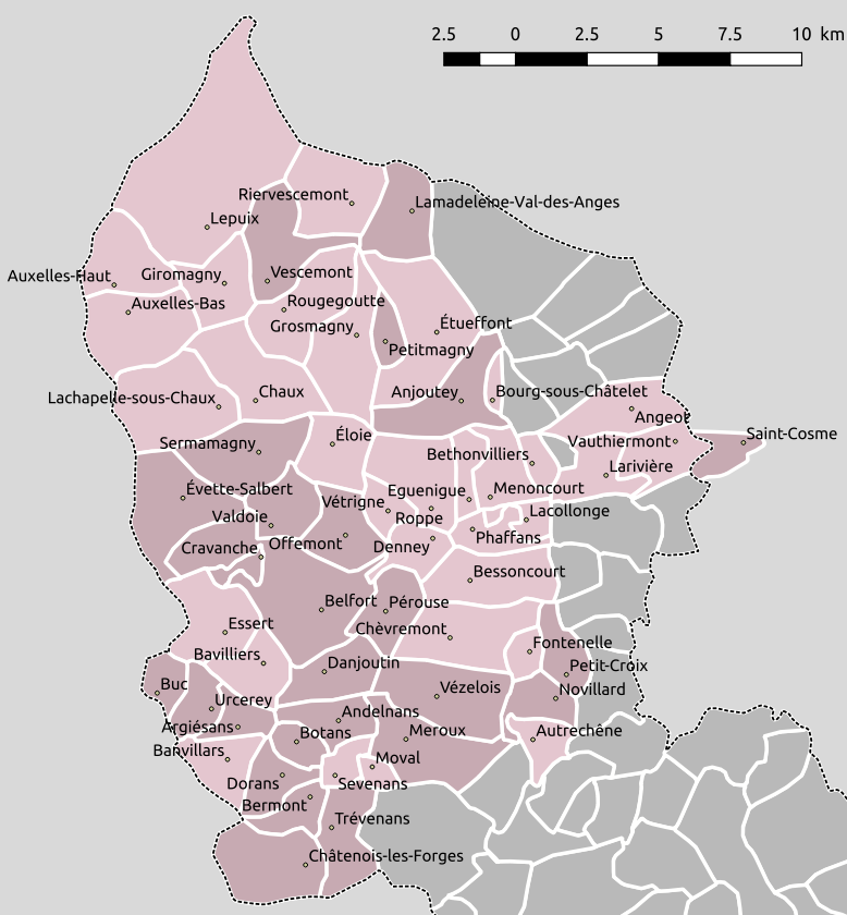 - Denney (commune) : Une partie des habitants relève de la seigneurie de Roppe, une autre de celle de Rougemont