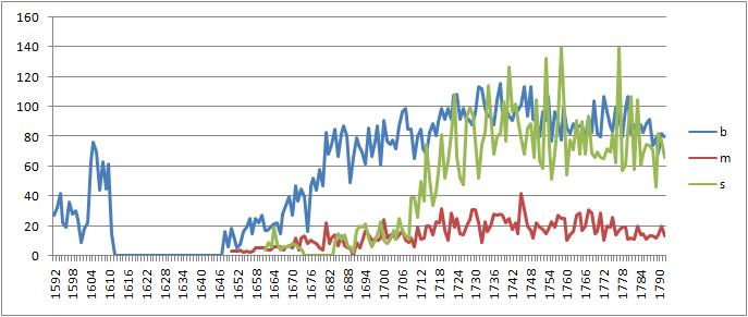On fait les mêmes remarques sur le graphique des bms, qu'il faudra interpréter en tenant compte du sous-enregistrement des sépultures avant 1720 :