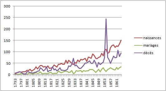 La plus violente est celle de 1854 : alors que la moyenne des décès est de 4 par mois à cette période, ils se montent à 20 en août de cette année, à 28 en septembre et surtout à 136 en octobre, avant de redescendre à 15 en novembre.