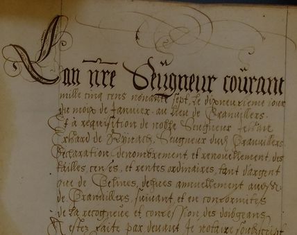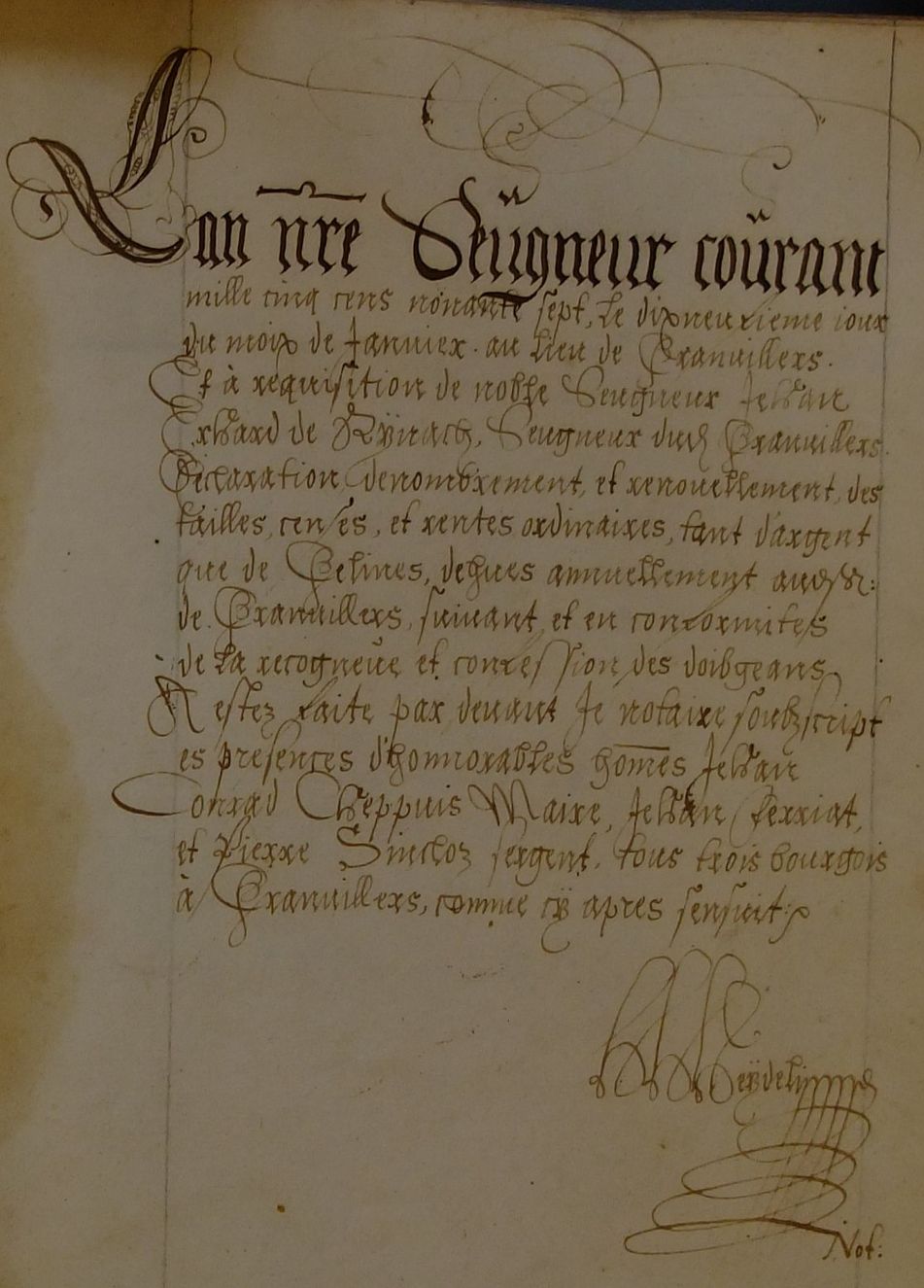 L'an nre Seugneur courant mille cinq cens nonante sept, le dixneufieme jour du moix de Janvier au lieu de Granvillers Et à requisition de noble Seugneur Jehan Erhard de Rynach, Seugneur dud. Granvillers Déclaration denombrement, et renouvellement des tailles, censes, et rentes ordinaires, tant d'argent que de Gelines, dehues annuellement aud.Sr. de Granvillers, suivant, et en conformités de la recongneue et confession des doibgeans A estez faite par devant Je notaire soubzscript es presences d'honnorables hommes Jehan Conrad Cheppuis, Jehan Ferriat et Pierre Sincloz sergent, tous trois bourgois à Grandvillers, comme cy apres s'ensuit : (signature : HHHeydelimne)