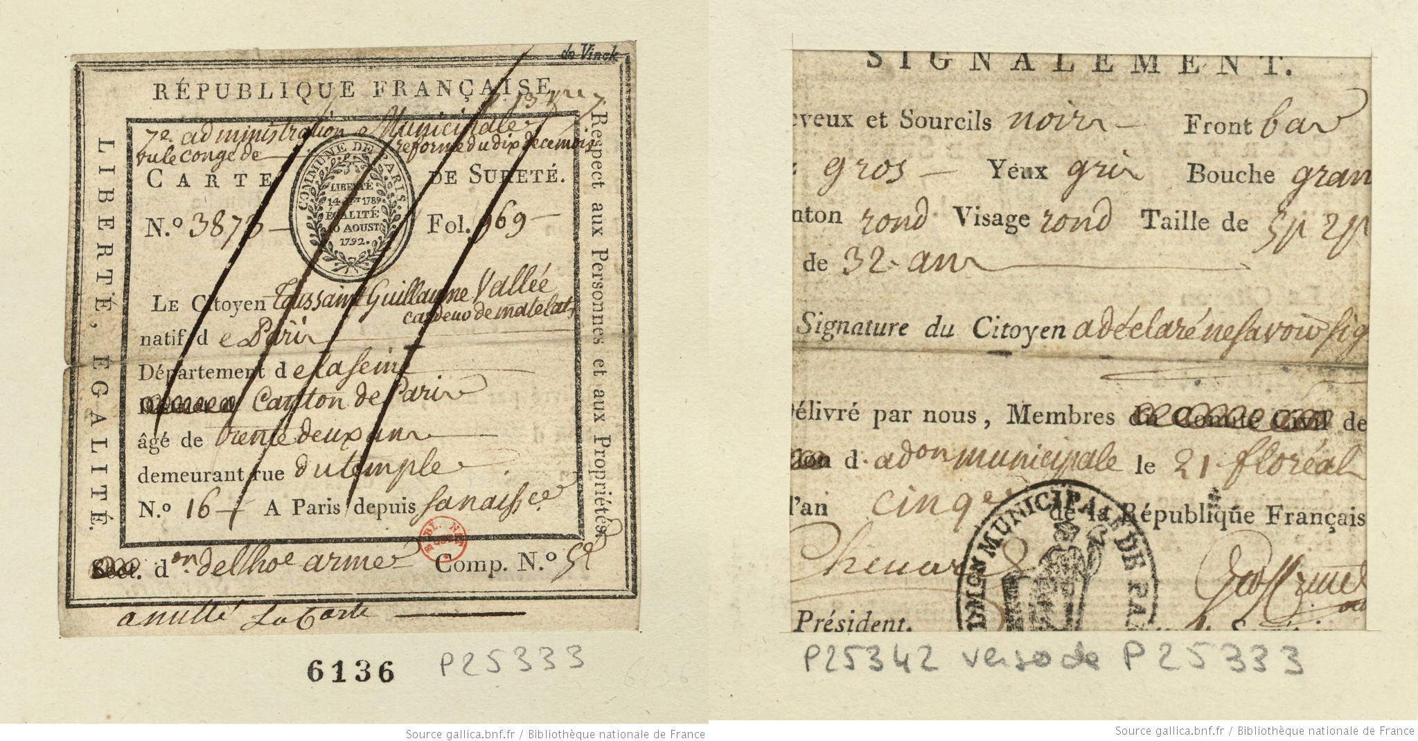Le 19 septembre 1792, l’Assemblée Nationale décrète que tous les habitants de Paris (hommes de plus de 15 ans) devront se faire enregistrer et se verront délivrer une carte, qu’ils seront tenus de présenter à toute réquisition des officiers de police ou commandants des forces armées.
