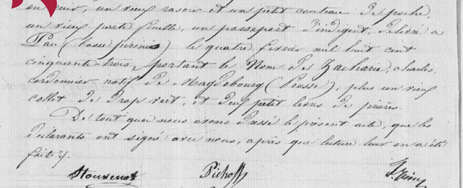 «... un passeport d'indigent délivré à Pau (basse pirénés) le quatre février mil huit cent cinquante-trois, portant le nom de Zacharie, Charles, cordonnier natif de Magdebourg (Prusse), plus un vieux collet de drap vert, et deux petit livres de prières. »
