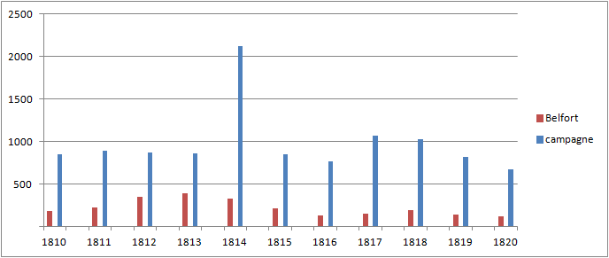 On observe ainsi une corrélation des taux belfortains (maximum en 1813-1814, maximum secondaire en 1817-1818) avec ces valeurs au plan national. Avec des valeurs considérablement plus élevées pour les premiers.