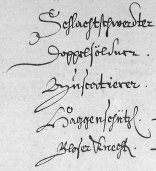 1 = Schlachtschwerdter ; 2 = Doppelsöldner ; 3 = Muscatierer ; 4 = Hackhenschützen ; 5 = Blose Knechten.