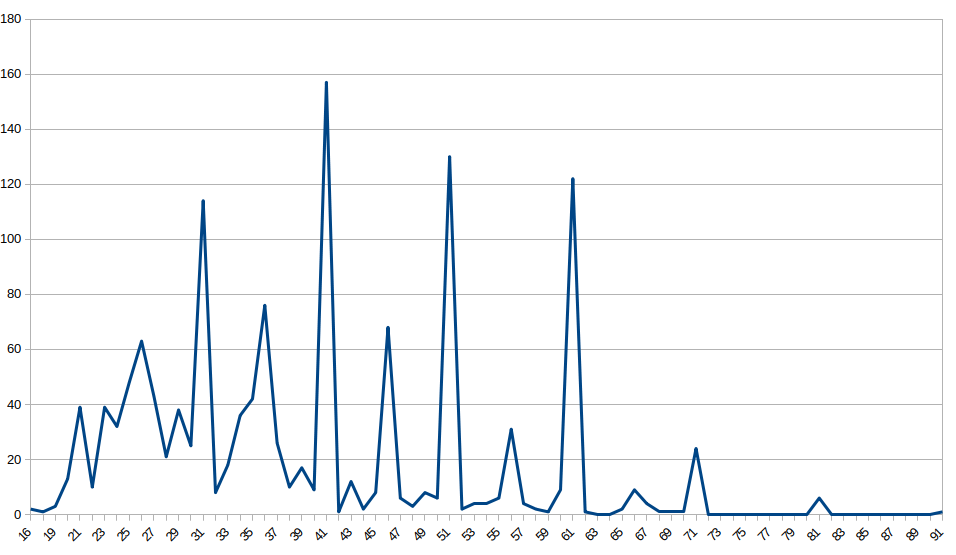 Mais la courbe des âges (tableau 3, ci-dessous) rend évidente une particularité : si jusqu'à 30 ans elle semble assez précise, parce que les gens connaissent bien leur âge, au-delà elle fait apparaître d'étonnantes "pointes" suivant la formule 10 n + 1 (où n représente le nombre des dizaines ; soit 31, 41, 51, … ans), et d'une manière un peu moins marquée pour 10 n + 6 (36, 46, …). Comment expliquer autrement que l'on trouve 9 hommes âgés de 40 ans, 157 de 41 ans, 1 seul de 42 ans ? ou de même 6 de 50 ans, 130 de 51 ans, 2 de 52 ans ? (diagramme 3).