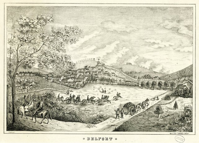Le train quittant la gare de Belfort, gravure