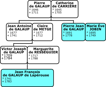 Comme le montre cette généalogie sur quatre générations, Pierre Jean Baptiste de GALAUP, fils de Pierre et d'Elisabeth de CARRIERE, qui épousa la fille du maître d'école de Grosne en 1721, était le grand-oncle de La Pérouse.
