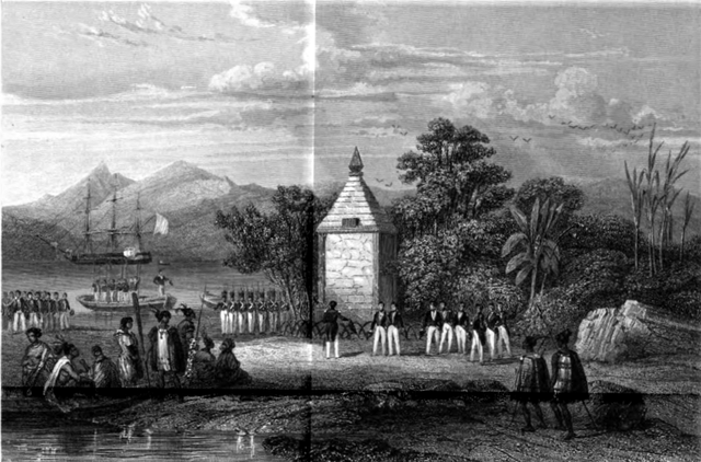 | Inauguration du monument élevé à Lapérouse à Vanikoro, par Dumont-d'Urville, en 1829.