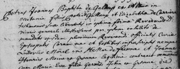 En date du 23 juin 1721, les registres de la paroisse de Grosne (55 E-dépôt GG2) contiennent l'acte de mariage de "Pierre Jean Baptiste de GALAUP d'Albi en Occitanie …avec Marie Eve fille de Bernard JOBIN de Grosne".