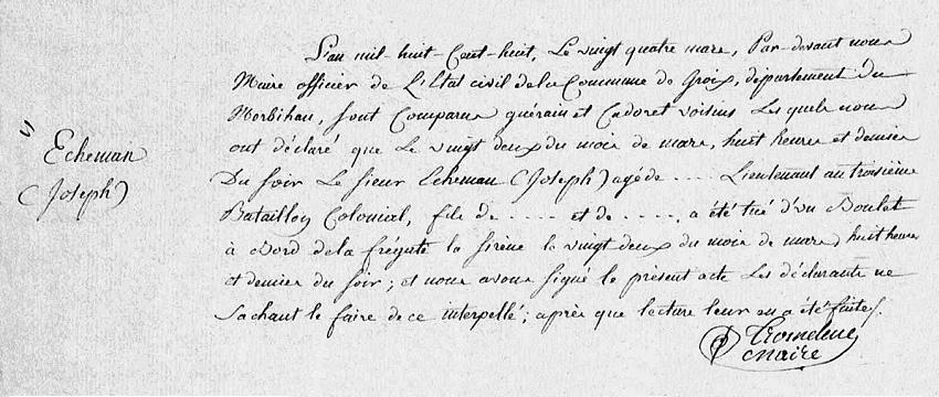 | L'an mil huit cent huit, le vingt quatre mars, pardevant nous maire officier de l'état-civil de la commune de Groix, département du Morbihan, sont comparus Guerain et Cadoret voisins, lesquels nous ont déclaré que le sieur Echeman (Joseph) âgé de …… lieutenant au troisième bataillon colonial, fils de …… et de ……. a été tué d'un boulet à bord de la frégate le Sirène le vingt deux du mois de mars huit heures et demie du soir ; et nous avons signé le présent acte, les déclarants ne sachant le faire, de ce interpelle, après que lecture leur a été faite. |
