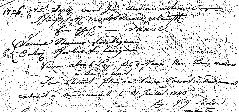 1726 den 25st september wordet zu Audincourt ... Grafschafft Montbelliard getaufft ein eheliges [Sohn] Daniel. Daniel Steiner von Lignau / Catei Gerber von Langnau