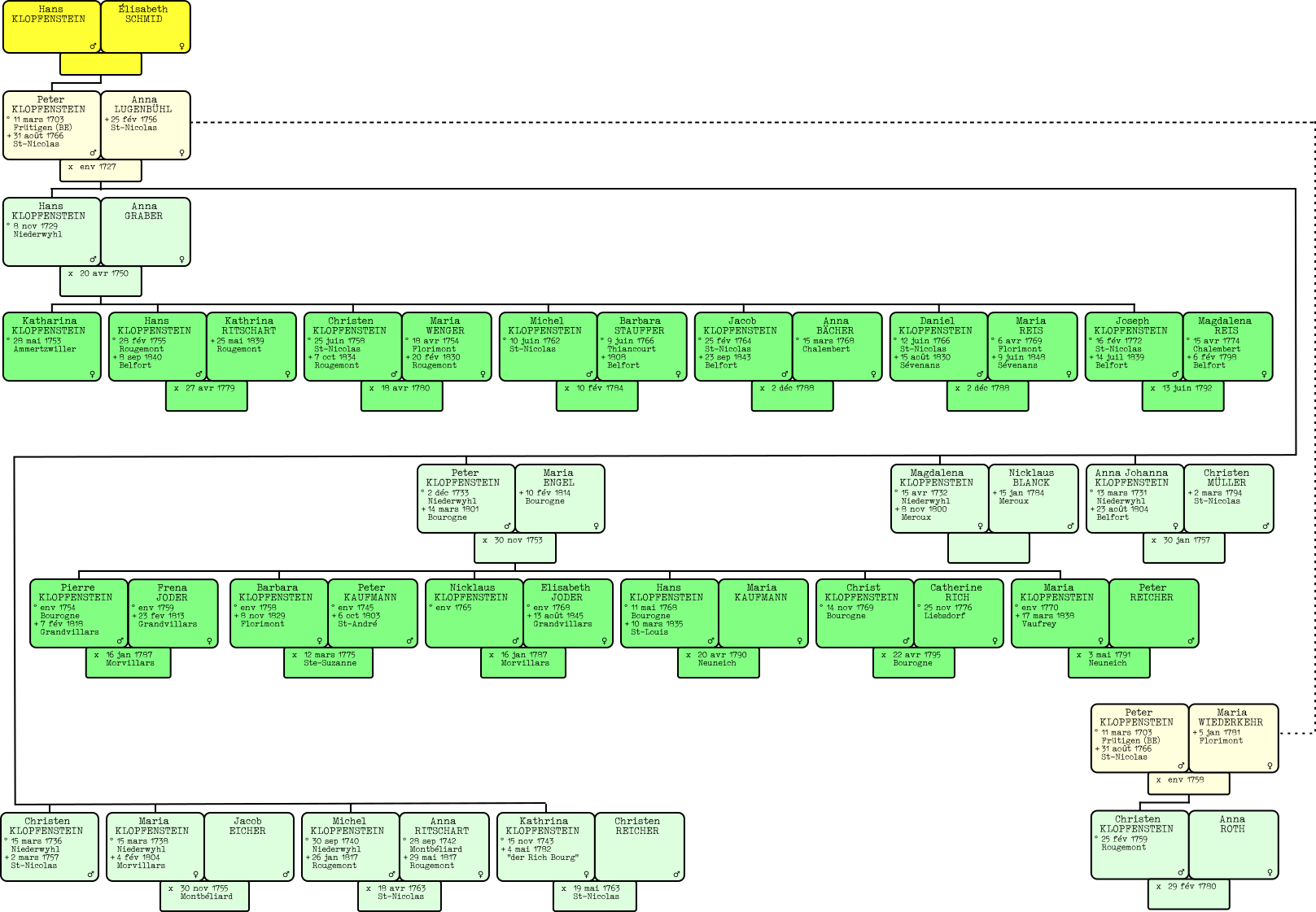 Cette visibilité permet de tracer leur généalogie. Nous nous limitons aux Klopfenstein potentiellement installés avant la Révolution :