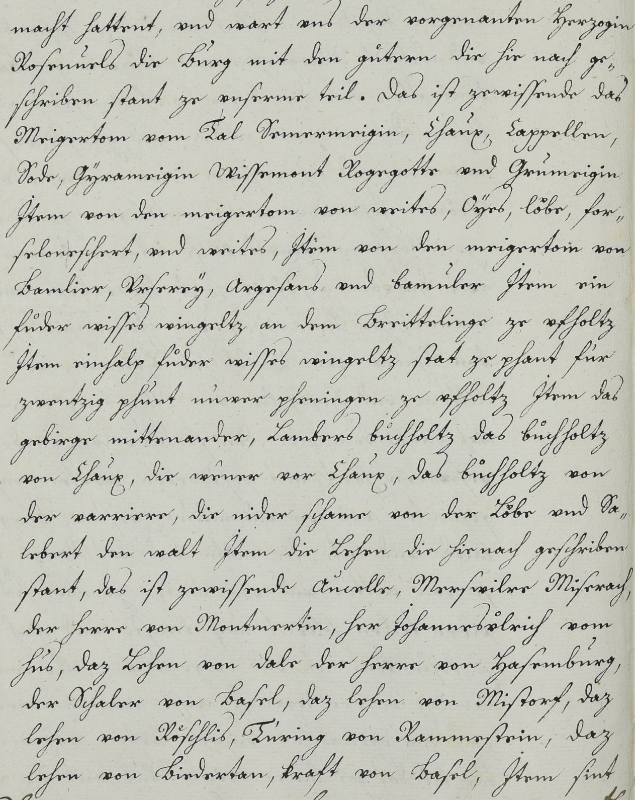 Voici en quoi consistent ces biens : les censes de la halle de Belfort, les fiefs héréditaires et les localités mineuressi Klaffer est une faute d'orthographe, pour Kaff(er) qui se trouvent dans cette part, item la moitié des revenus du sceau du tabellionné de Belfort, ainsi que l'avoine [sic] des biens de Me. Guillaume dans le faubourg supérieur, item les revenus et le droit que notre susdite mère à sur le moulin de BourogneBolle, item ce que notre susdite mère avait acquis du sire de Hettwiller à Sommerkhilche et à Traubach, item la mairie de Pérouse que notre mère y tient du comté de Montbéliard, de Pérouse, Dorans et Bessoncourt, Meiginhanat, Eguenigue, MenoncourtMimingen possiblement pour Müningen, RottwillerRougegoutte ? et Vétrigne, item l'étang de Belfort, item Offemont du Val et le village de BucBirr avec la chênaie et les revenus y afférents. Item la moitié du bien gagé de Cosonal à Suarce Schwerzinger, qui vaut 140 livres de pfennig.