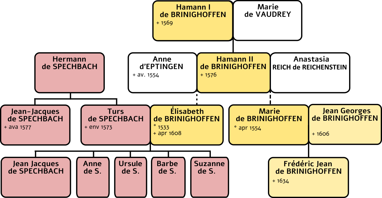 Cette partie s'appuie essentiellement sur l'étude de D. J. Lougnot (3), notamment sur les informations concernant les enfants d'Hamann II de Brinighoffen, issues sans doute du document AD68 132J 553/2, qui en renferme la liste.