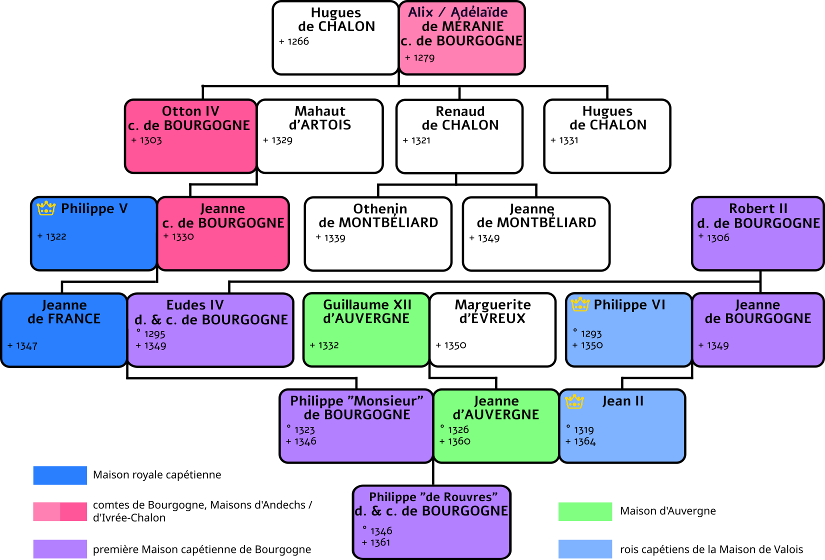 Philippe "Monsieur" mourut avant son père, c'est donc à son fils Philippe "de Rouvres" que revint ce considérable héritage. - Le second mari de Jeanne d'Auvergne fut Jean II "le Bon", roi de France, second de la dynastie de Valois, qui l'a épousée en secondes noces ; notons également que la mère de Jean II était la sœur d'Eudes IV. Le couple n'eut pas d'enfants survivants.