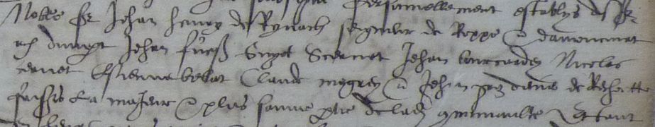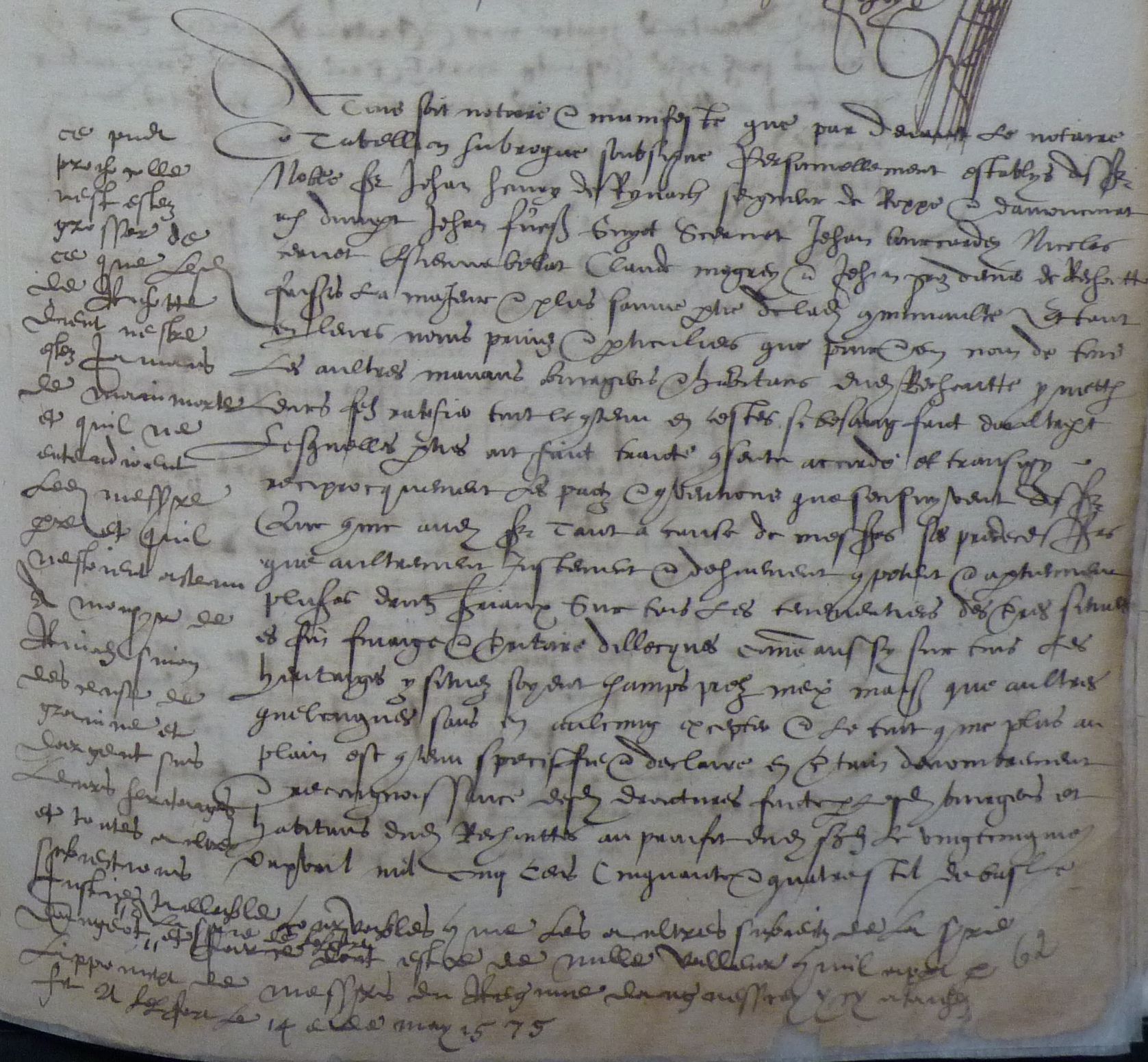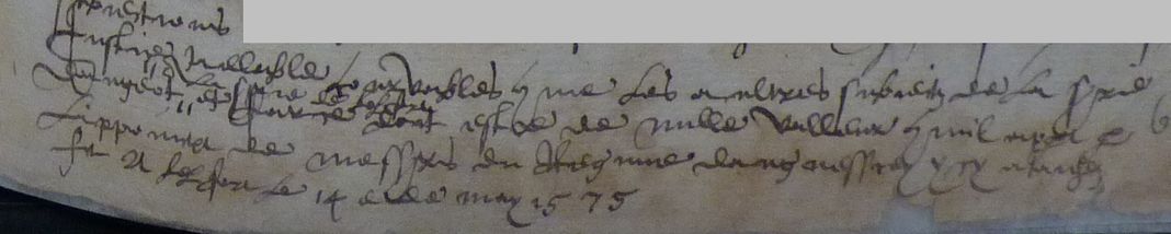 - Chronologiquement enfin, en marge de la 1ère page, une mention du 14 mai 1575 remet en question la valeur des actes précédents et maintient le doute sur la condition (servile ou libre) des habitants de Rechotte avant 1572. Elle est par contre très éclairante sur les rapports d'autorité en cette fin du XVIe siècle.