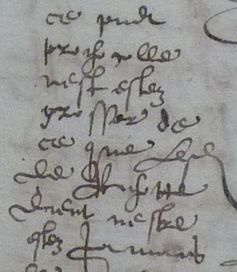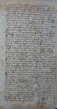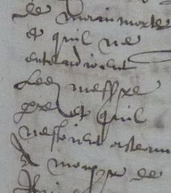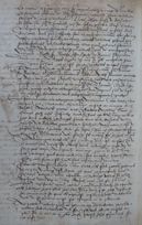 8) Ici est précisé le montant de la cense : pour chaque journal de champ ou fauchée de pré, le tenementier doit annuellement 7 derniers et un coupot d'avoine. Le montant serait passé de 5 à 7 deniers en contrepartie de l'abandon par le seigneur d'une redevance annuelle (globale pour la communauté) de 16 chapons dont les habitants sont dorénavant quittes, compte tenu qu'ils affirment n'avoir payé antérieurement que 5 deniers. L'application de cette cense nécessitait la tenue précise d'un registre ("terrier" ou "rentier") précisant, à date, le tenancier de chaque parcelle (tenure). L'évocation d'une redevance en poules (chappons) est une autre marque de servitude ; mais il y a ici doute sur l'existence de cette redevance. |